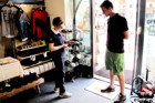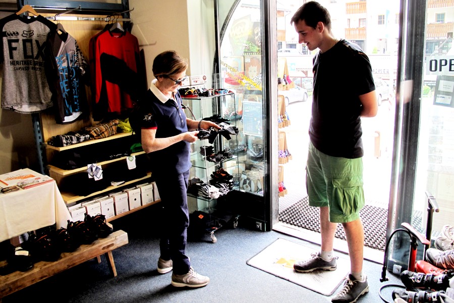 In questo negozio, specializzato in articoli per ciclisti, Fausta sta scegliendo un paio di guanti per nostro