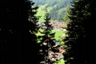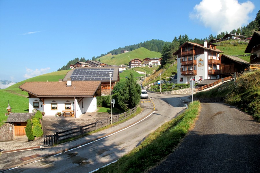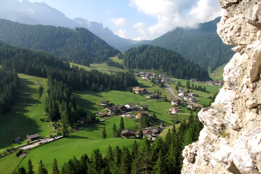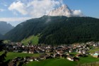 Una panoramica dell'abitato di Selva dal sentiero della Via Crucis. Sullo sfondo il Sassolungo.