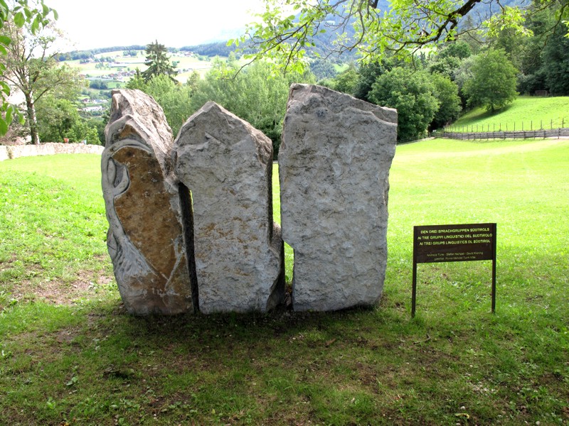 Foto 3/55 - Castel Presule. Una composizione, costituita da tre blocchi di pietra, dedicata ai tre gruppi linguistici del Sud Tirolo.