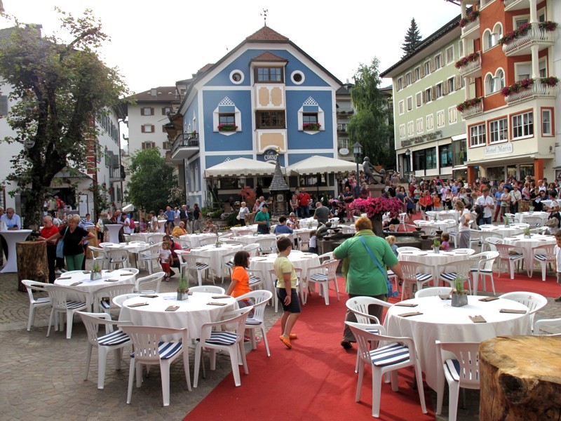 Foto 32/40 - Ortisei. Piazza S. Antonio con i tavoli pronti in attesa dei commensali.