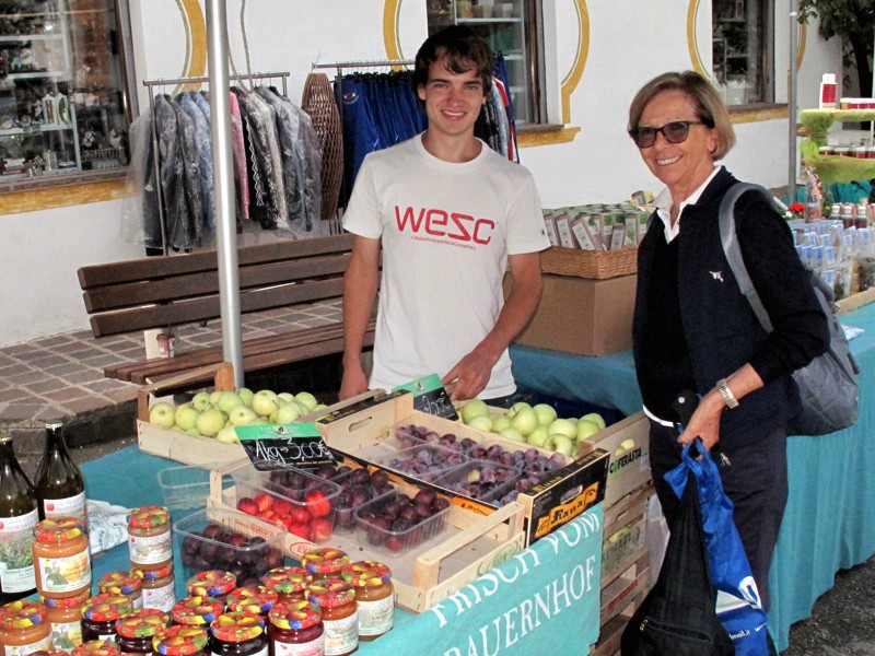 Foto 9/20 - Fausta in compagnia di un giovane che vendeva la frutta al mercatino di Siusi. Ci ha tenuto molto a raccomandarci delle «prugnette» che la sua famiglia produce in un maso di S. Vigilio. Ha perorato la sua causa