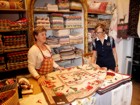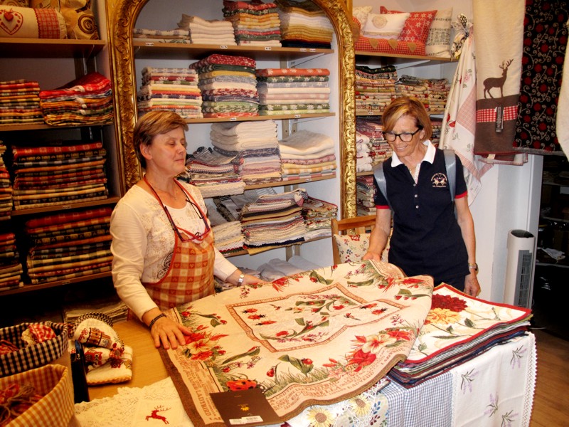Foto 11/20 - La proprietaria del negozio di tessuti sotto i portici di Bolzano mostra a Fausta, con atteggiamento fiero, uno dei prodotti della sua azienda: una tovaglietta in stile tirolese.