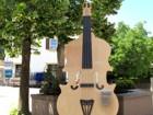 Foto 11/40 - Siusi. Piazza Wolkenstein. Davanti alla fontana la sagoma di un contrabbasso che promuove le