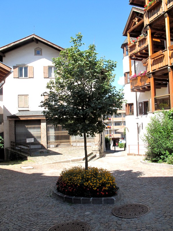 Foto 22/40 - Siusi. Una simpatica aiuola fiorita, con un albero al centro, lungo la stradina che porta giù, verso il centro del paese.