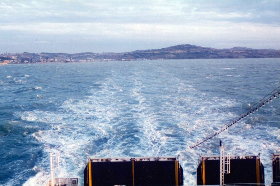 in navigazione e in lontananza sparisce, un po' alla volta, il porto di Ancona.