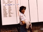 Fausta davanti al tabellone principale dove, oltre ai nominativi dei partecipanti suddivisi nelle tre categorie, sono indicati soltanto gli "handicap".