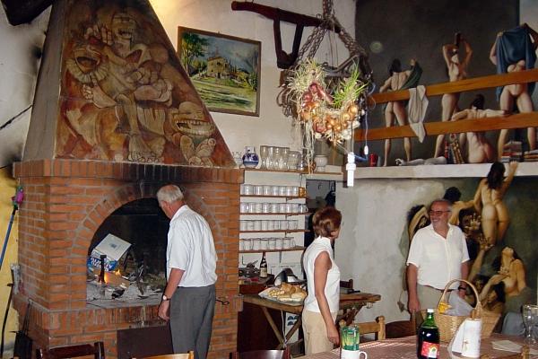 Il bel "living" della casa. Ezio sta accendendo il fuoco per potervi arrostire le salsicce. Sullo sfondo, a destra, le pareti affrescate con scene di ... baccanti