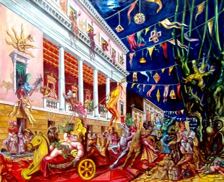 Un quadro ad olio raffigurante la nascita del Carnevale a Viareggio.