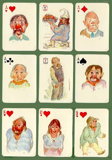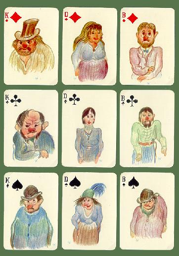 Immagini caricaturali connesse ad aspetti che riguardano l'ebbrezza causata dall'alcool su ognuna delle 54 carte.