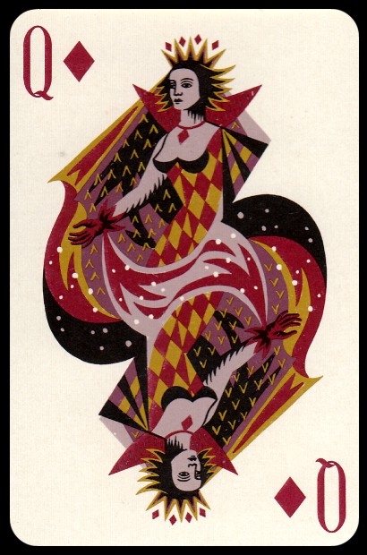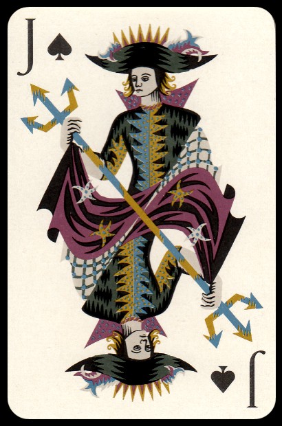 Le figure del seme di Quadri traggono ispirazione dai trovatori ed altri personaggi del romanzo medievale. Il fante mascherato è atteggiato a suonatore di liuto.